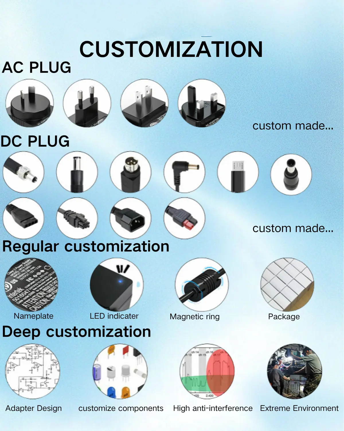 Мы являемся заводом по производству источников питания переменного/постоянного тока, который может настроить любой адаптер питания и пройти соответствующие сертификаты.