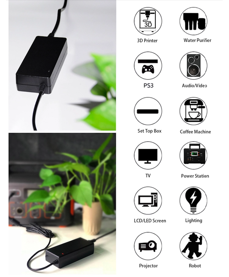 * Дополнительные устройства для серии 120 Вт: доступны 12 В/15 В/20 В/24 В/36 В/48 В. * Безопасность: OCP/OVP/OTP, SCP, автоматическое отключение при перегрузке, отключение при превышении напряжения, автоматическое отключение при перегреве. * Широкая совместимость: светодиодные ленты, 3D-принтер, приемопередатчик любительского радио, камеры видеонаблюдения, автомобильный усилитель для сабвуфера, аудиоусилитель, беспроводной маршрутизатор, ADSL Cats, увлажнитель, концентратор, клавиатура, динамик BT, монитор, веб-камера, DVR, NVR, источник питания аудио/видео.
