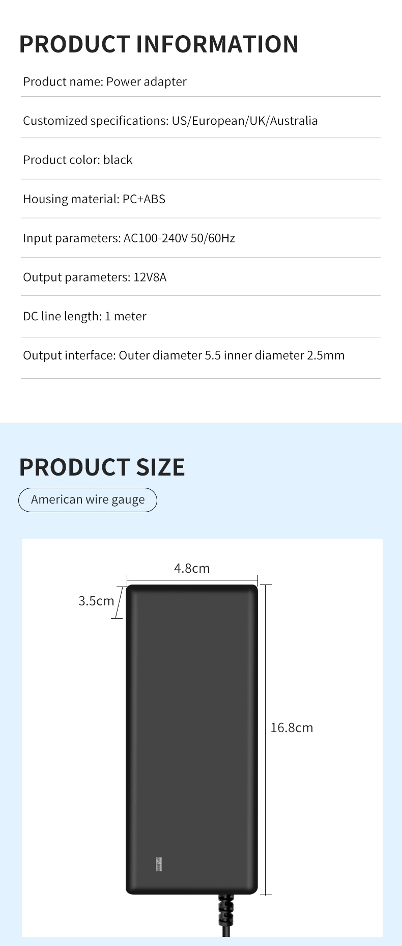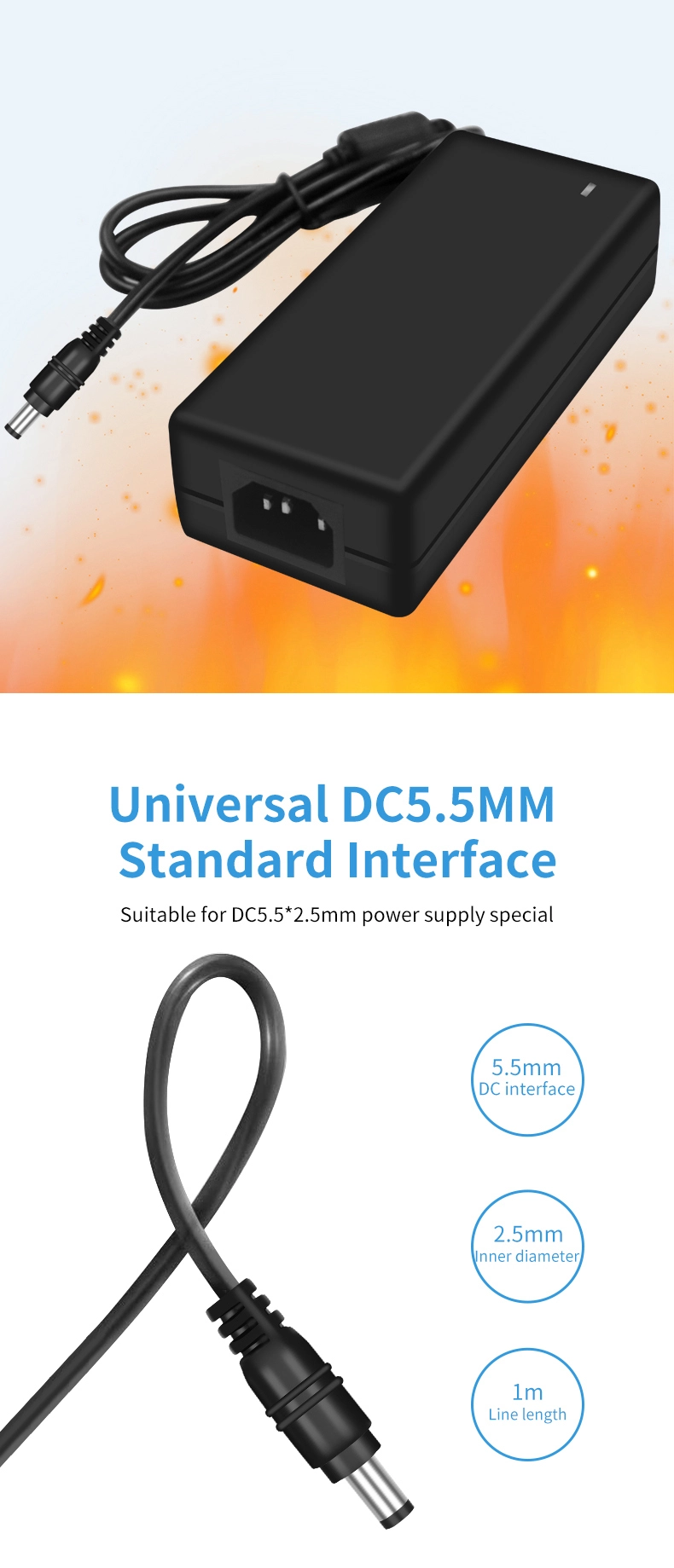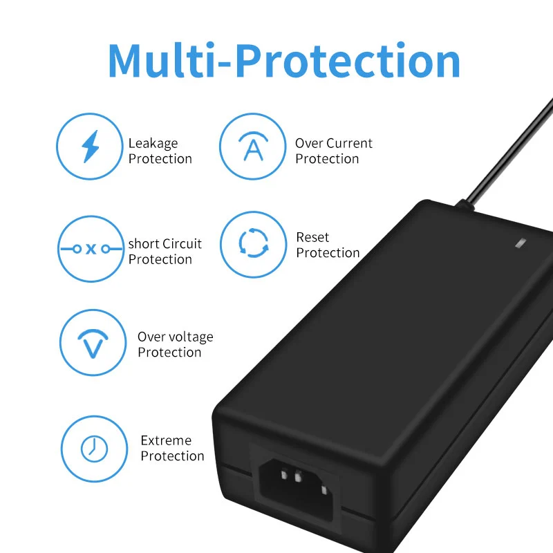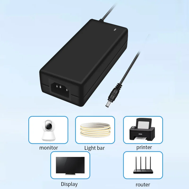 Входное напряжение переменного тока шириной 100–240 В совместимо с электросетями более чем 100 стран мира. Удлиненный выходной кабель длиной 1,5 м (диаметр 1,0 мм²) в сочетании с поворотным на 180° разъемом постоянного тока адаптируется к различным сценариям установки. Имея компактные размеры всего 120×60×30 мм, он на 35% меньше традиционных адаптеров той же мощности и весит всего 280 г, что повышает портативность на 50%.
