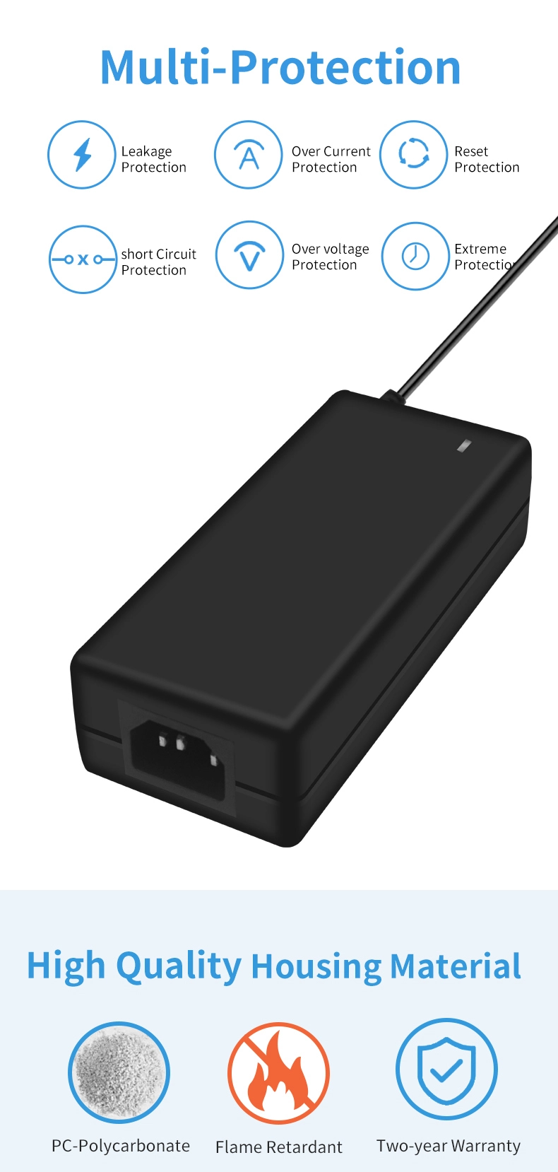 Адаптер питания STARWELL сертифицирован по международным стандартам, таким как UL/CE/FCC/CCC, и имеет 6-уровневую защиту (OVP срабатывает при 15 В, OCP при 8,5 А, OTP при 85 ℃, защита от короткого замыкания, перенапряжения и электростатического разряда). Огнестойкий корпус PC+ABS достигает класса воспламеняемости V0, выдерживая горение в течение 30 секунд при горении при температуре 750 ℃, что исключает потенциальную угрозу безопасности.