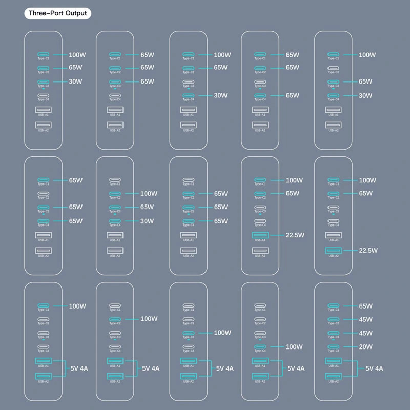 Выход USB C1/C2/C3/C4: 5 В/3 А 9 В/3 А 12 В/3 А 15 В/3 А 20 В/5 А (макс. 100 Вт) USB A1/A2: 5 В/3 А 9 В/2 А 12 В/1,5 А (макс. 18 Вт) |