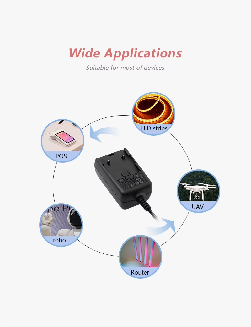 Широкий спектр сценариев применения: будь то питание светодиодных лент, интеллектуальных динамиков, сетевых маршрутизаторов или других небольших электроприборов, этот мощный импульсный блок питания со сменной вилкой — ваш самый идеальный и надежный выбор!