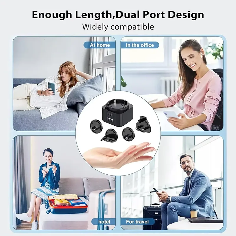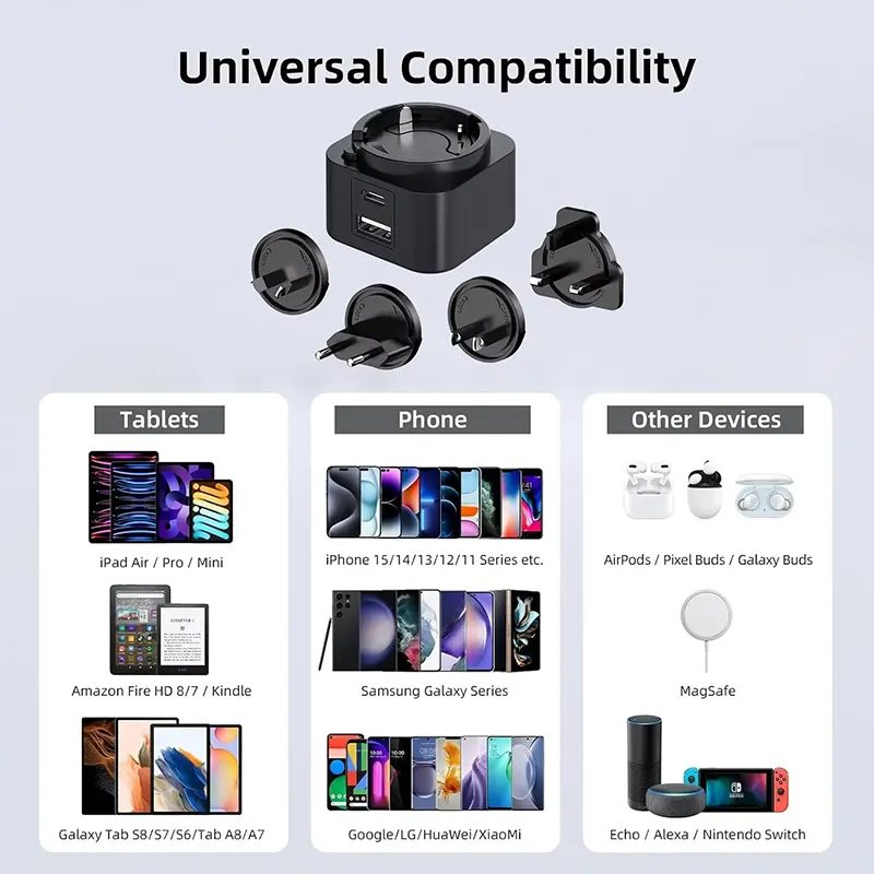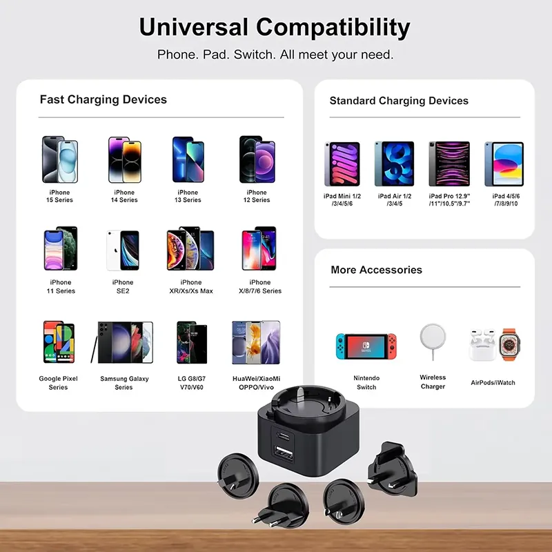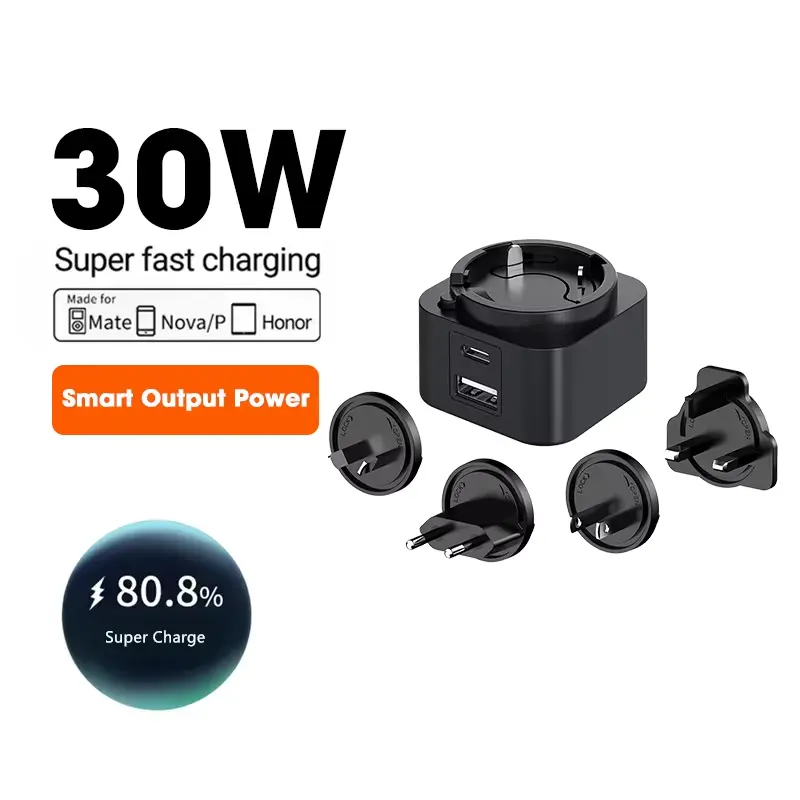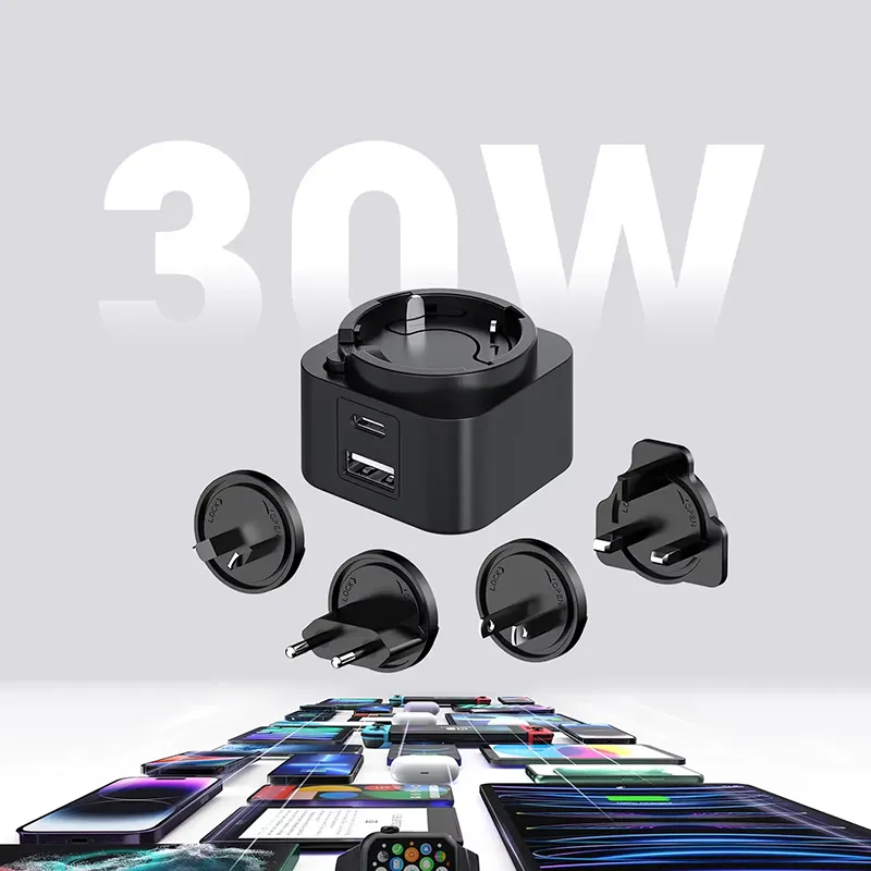Универсальность является ключевым моментом. Конструкция с двумя портами (USB-C/USB-A) позволяет заряжать два устройства одновременно. Зарядное устройство PD со сменной вилкой мощностью 30 Вт оснащено набором сменных вилок (США/ЕС/Великобритания/Австралия), что делает его идеальным спутником в путешествиях по всему миру. Независимо от того, заряжаете ли вы смартфон, планшет или ноутбук, универсальная совместимость обеспечивает высочайшую производительность.