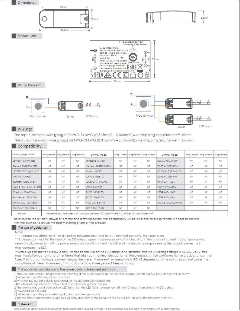 Высококачественный симисторный светодиодный драйвер с постоянным током PE294R, 42 В, макс. 200 мА, является одним из светодиодных дайверов с постоянным током, разработанным китайским производителем Starwell, с высоким коэффициентом мощности, высокой эффективностью, высокой точностью, использованием эффективной микросхемы управления переключателем с низкими потерями и высокопроизводительными компонентами, обеспечивающими низкий уровень шума, длительный срок службы и другие характеристики.