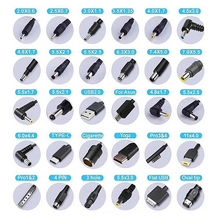 Доступны USB-C, 5,5x2,1 мм, 5,5x2,5 мм, 4,0x1,7 мм, 3,5x1,35 мм и другие. |