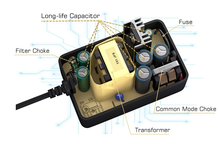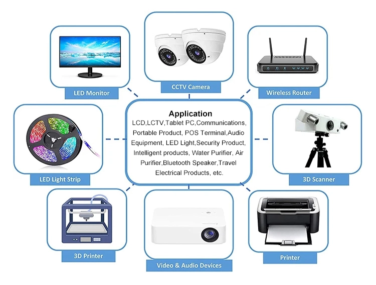 * Доступны дополнительные устройства для серии 48 Вт: 5 В/9 В/12 В/15 В/19 В/24 В/36 В/48 В. * Безопасность: OCP/OVP/OTP, SCP, автоматическое отключение при перегрузке, отключение при превышении напряжения, автоматическое отключение при перегреве. * Широкая совместимость: светодиодные ленты, 3D-принтер, приемопередатчик любительского радио, камеры видеонаблюдения, автомобильный усилитель для сабвуфера, аудиоусилитель, беспроводной маршрутизатор, ADSL Cats, увлажнитель, концентратор, клавиатура, динамик BT, монитор, веб-камера, DVR, NVR, источник питания аудио/видео.