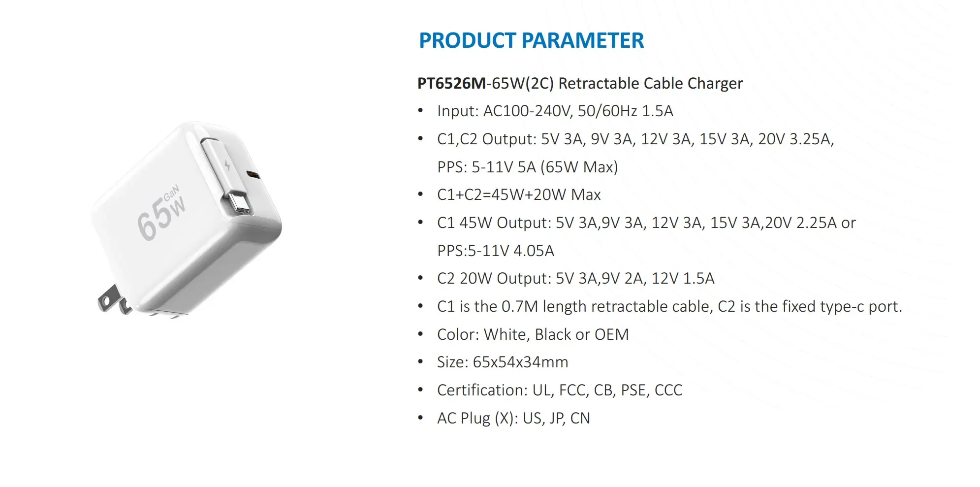 Зарядное устройство PD мощностью 65 Вт с гибким кабелем USB-C. Технические характеристики: