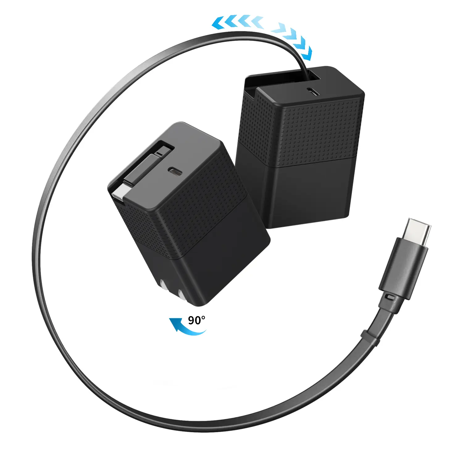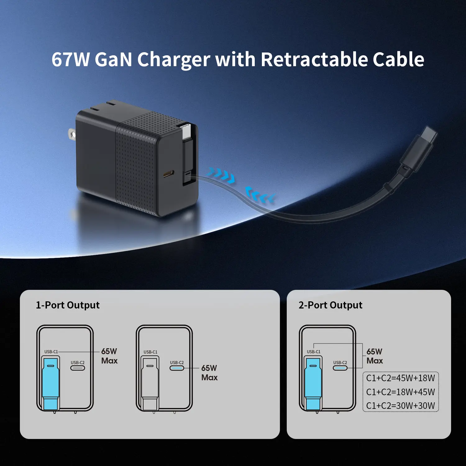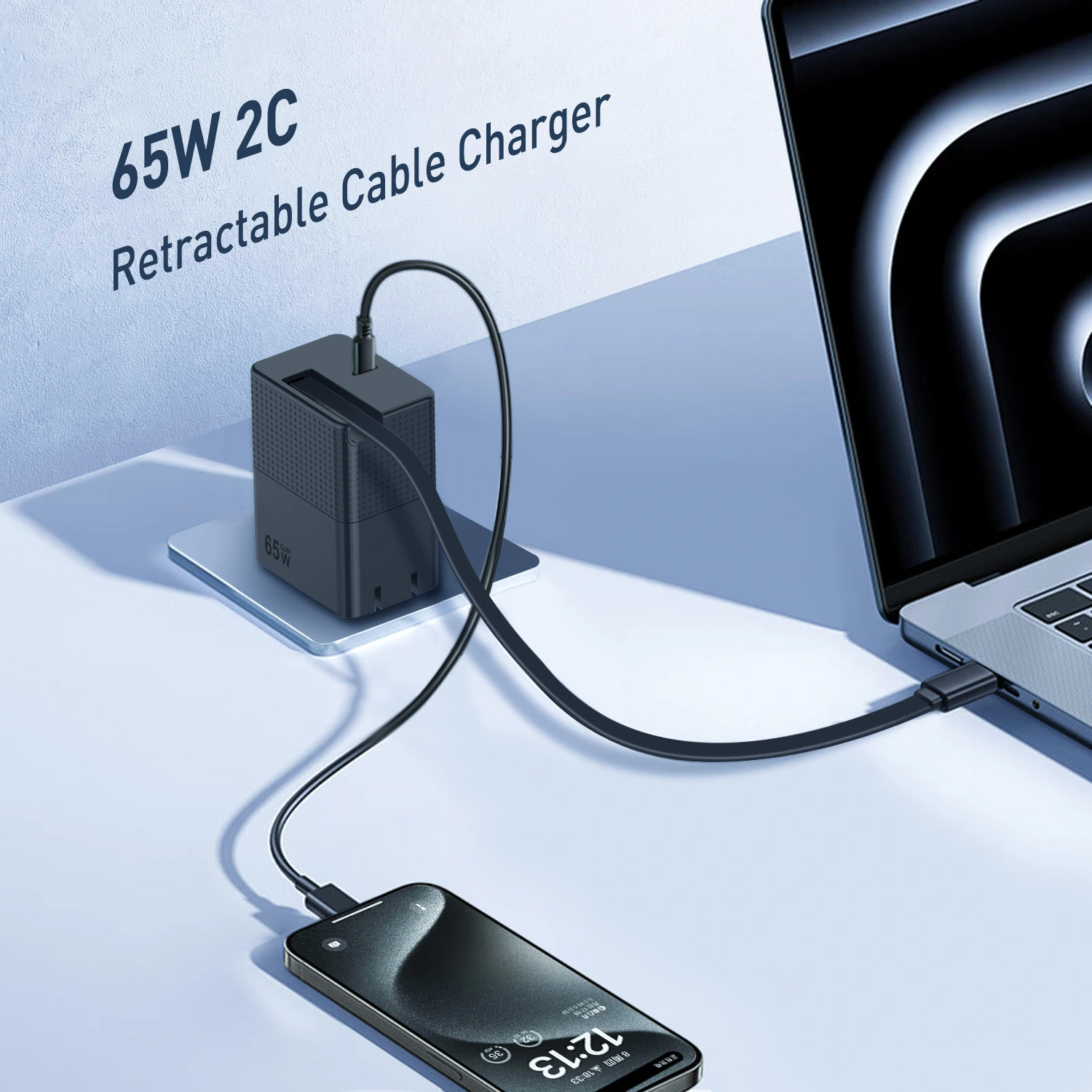 Оснащен выдвижными кабелями. Адаптер для быстрой зарядки мощностью 65 Вт оснащен удобным и не запутывающимся кабелем передачи данных USB-C длиной 2,3 фута (1 метр). Этот кабель можно плавно выдвигать и втягивать, что позволяет избежать путаницы из запутанных кабелей и обеспечить возможность зарядки в любое время.