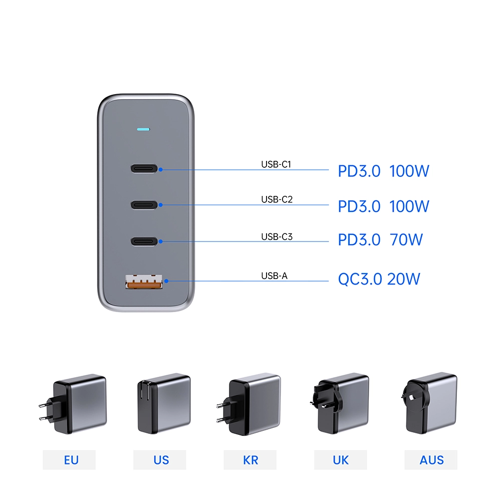 Выход C1/C2: 5В3А,9В3А,12В3А,15В3А,20В5А,PPS:3,3-20В5А (макс. 100 Вт) Выход C3: 5 В 3 А, 9 В 3 А, 12 В 3 А, 15 В 3 А, 20 В 3,5 А, (макс. 70 Вт) PPS: 3,3-11 В 5 А Выход USB-A: 5 В 3 А, 9 В 2 А, 12 В 1,67 А, SCP: 3,3–11 В 2 А (макс. 22 Вт) Выход C1+C2/C1+C3: 70 Вт+30 Вт C1+C2+(C3+USB-A) Выход: 40Вт+40Вт+15Вт Итого: 100 Вт |