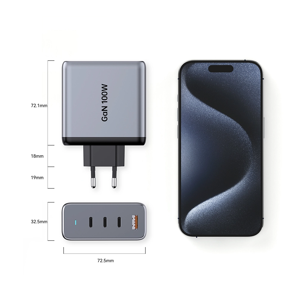 Быстрое зарядное устройство GAN 100 Вт для ноутбука CE. Быстро заряжайте несколько устройств одновременно, чтобы поддерживать порядок и порядок на рабочем месте. Надежное быстрое зарядное устройство Starwell GaN мощностью 100 Вт оснащено тремя портами USB-C и одним портом USB-A, что позволяет одновременно заряжать до четырех устройств. Будь то деловое или домашнее использование, он с легкостью справится с любыми задачами. От вашего ноутбука, мобильного телефона, планшета до умных часов — все можно полностью зарядить вместе, что в конечном итоге положит конец эпохе использования розеток. Это обеспечивает простоту и высокую эффективность вашего рабочего стола.