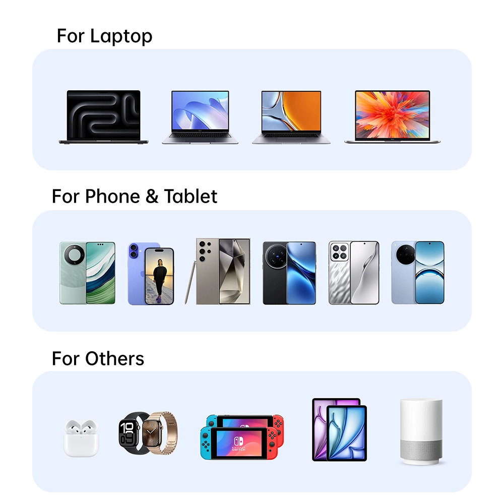 Мощность 100 Вт: энергетическая станция вашего ноутбука По своей сути порты USB-C1 и C2 поддерживают пиковую мощность до 100 Вт. Этой мощной мощности передачи достаточно для удовлетворения требований быстрой зарядки большинства ноутбуков. Независимо от того, используете ли вы MacBook Pro или другие высокопроизводительные ультрабуки, их скорость зарядки может быть сопоставима с производительностью оригинальных зарядных устройств или даже быстрее. Сохраняйте энергию, сосредоточьтесь на творчестве и продуктивности и не беспокойтесь о времени автономной работы при использовании устройства.