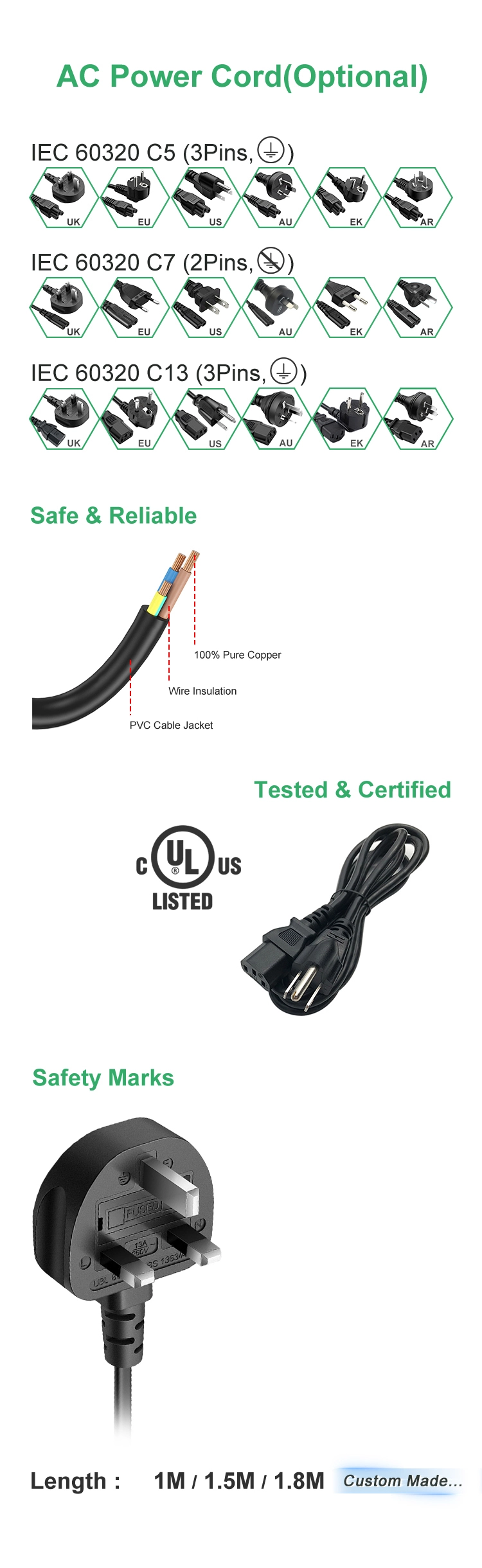 *Доступны дополнительные устройства для серии 200 Вт: 5 В/8 В/9 В/12 В/13,5 В/15 В/18 В/19 В/24 В/25 В/30 В/36 В/29 В/30 В/42 В/48 В. * Безопасность: OCP/OVP/OTP, SCP, автоматическое отключение при перегрузке, отключение при превышении напряжения, автоматическое отключение при перегреве. * Широкая совместимость: светодиодные ленты, 3D-принтер, приемопередатчик любительского радио, камеры видеонаблюдения, автомобильный усилитель для сабвуфера, аудиоусилитель, беспроводной маршрутизатор, ADSL Cats, увлажнитель, концентратор, клавиатура, динамик BT, монитор, веб-камера, DVR, NVR, источник питания аудио/видео.